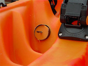 Access is limited from the outside of the hull, so using the circle cutter could prove very difficult. Cutting from the inside of the hull via the hatch and using the pilot hole as a guide may prove easier when cutting the 50 mm hole.