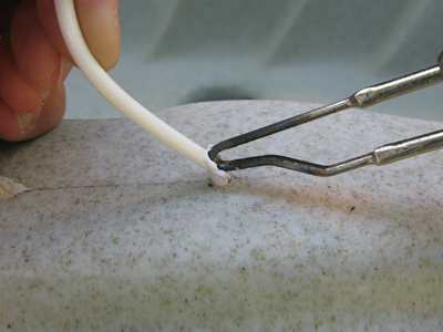 You can use a golf tee for this, but we had some polyethylene welding repair rods so chose to use these to make the repair waterproof, we didn't have a colour match but the repair will be hidden under the rail so no problem.
